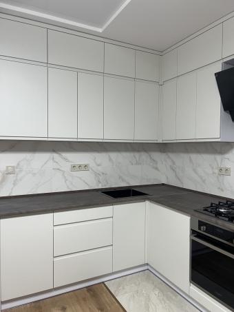Кухня під замовлення,що поєднує в собі концепцію використання різних матеріалів фасадної частини: фарбовані МДФ-фасади та фасади з ламінованої ДСП у деревоподібній текстурі. Стільниця в тому ж декорі підкреслює природність і додає відчуття затишку. Світлі тона, тепле дерево та продумане планування формують практичний і візуально збалансований простір.