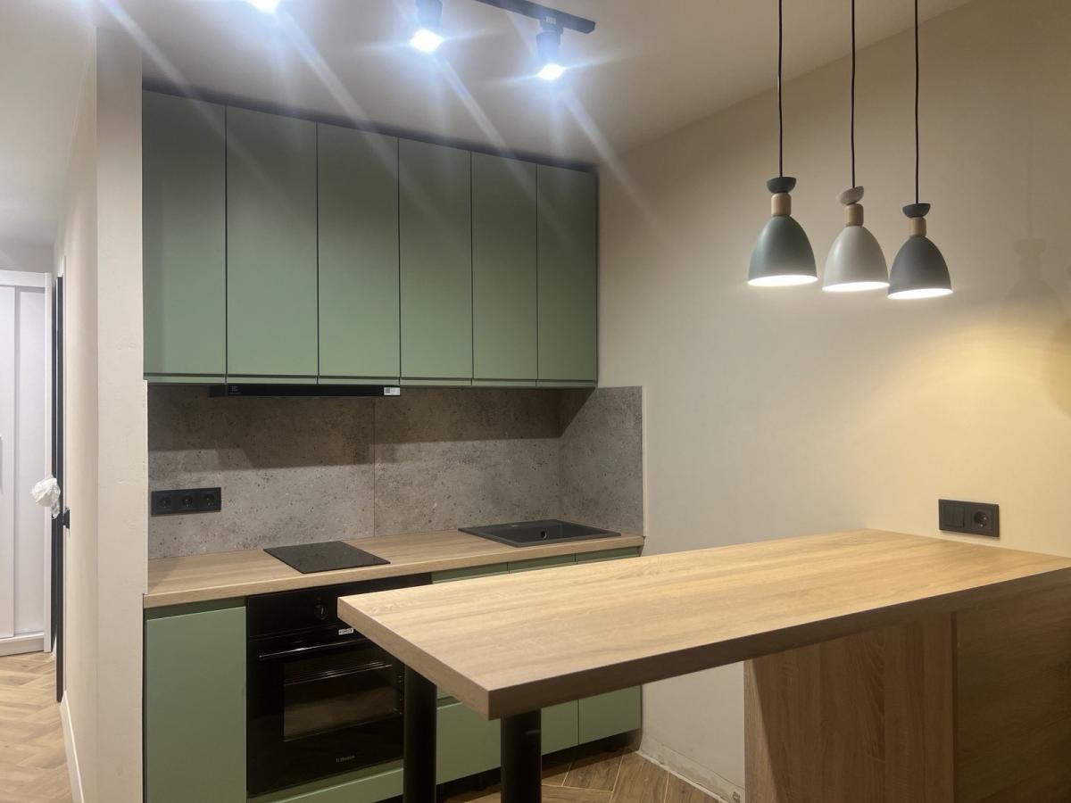 Барна стійка, виконана під замовлення, збільшує робочу зону та стильно замінює обідній стіл. Лаконічне освітлення й продумане планування роблять інтер’єр зручним для щоденного використання.