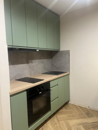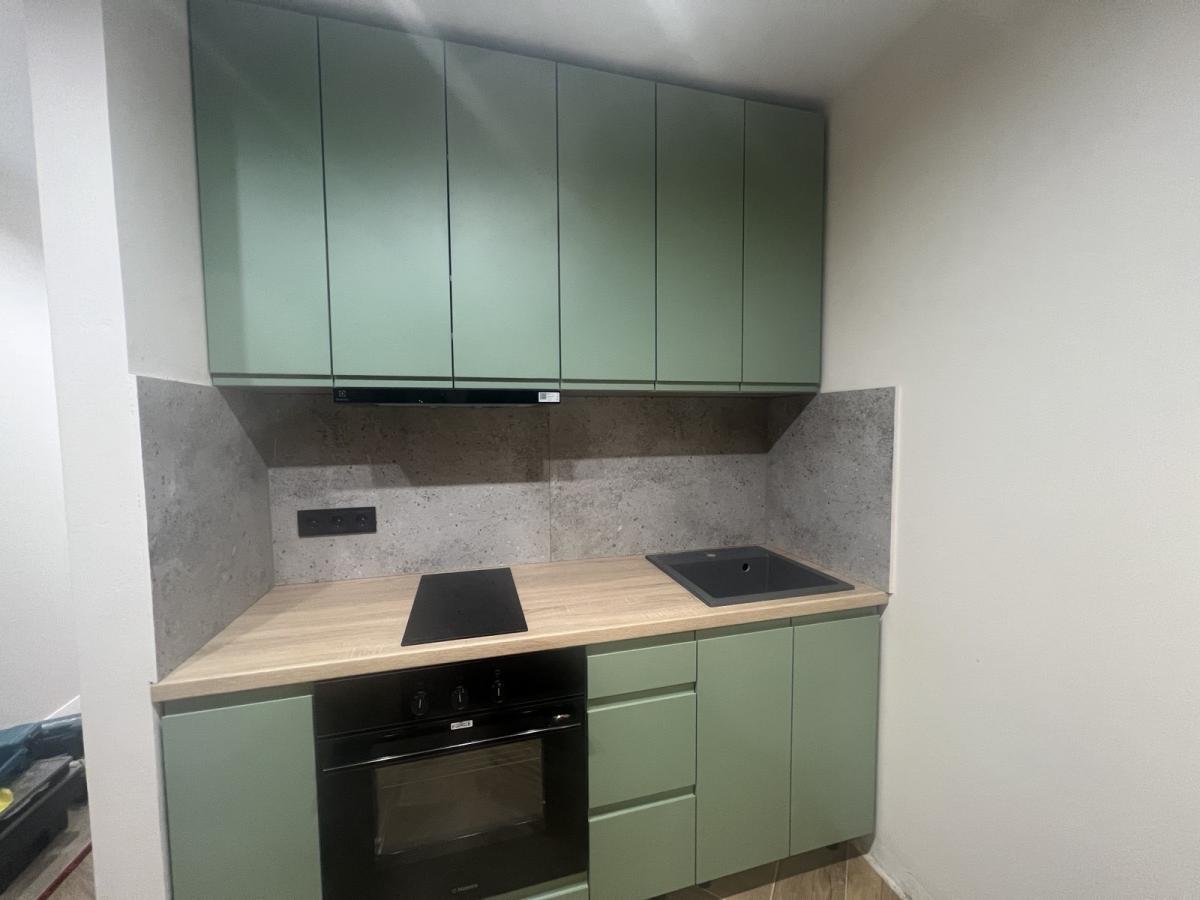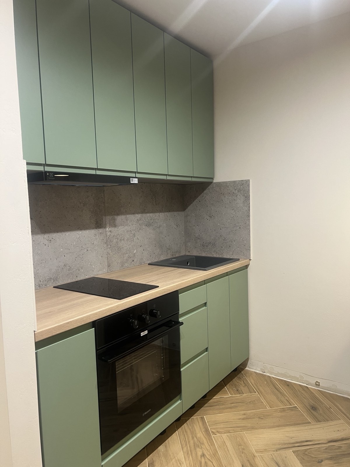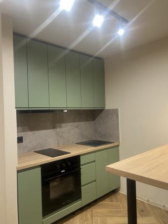 Маленька, але стильна кухня Інтерно/Interno — приклад того, як компактний простір може виглядати сучасно й функціонально. Фарбовані фасади у зеленому кольорі створюють спокійний, актуальний настрій, а стільниця Сонома додає тепла та природності.
