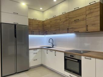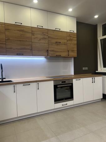 Кухня під замовлення,що поєднує в собі концепцію використання різних матеріалів фасадної частини: фарбовані МДФ-фасади та фасади з ламінованої ДСП у деревоподібній текстурі. Стільниця в тому ж декорі підкреслює природність і додає відчуття затишку.